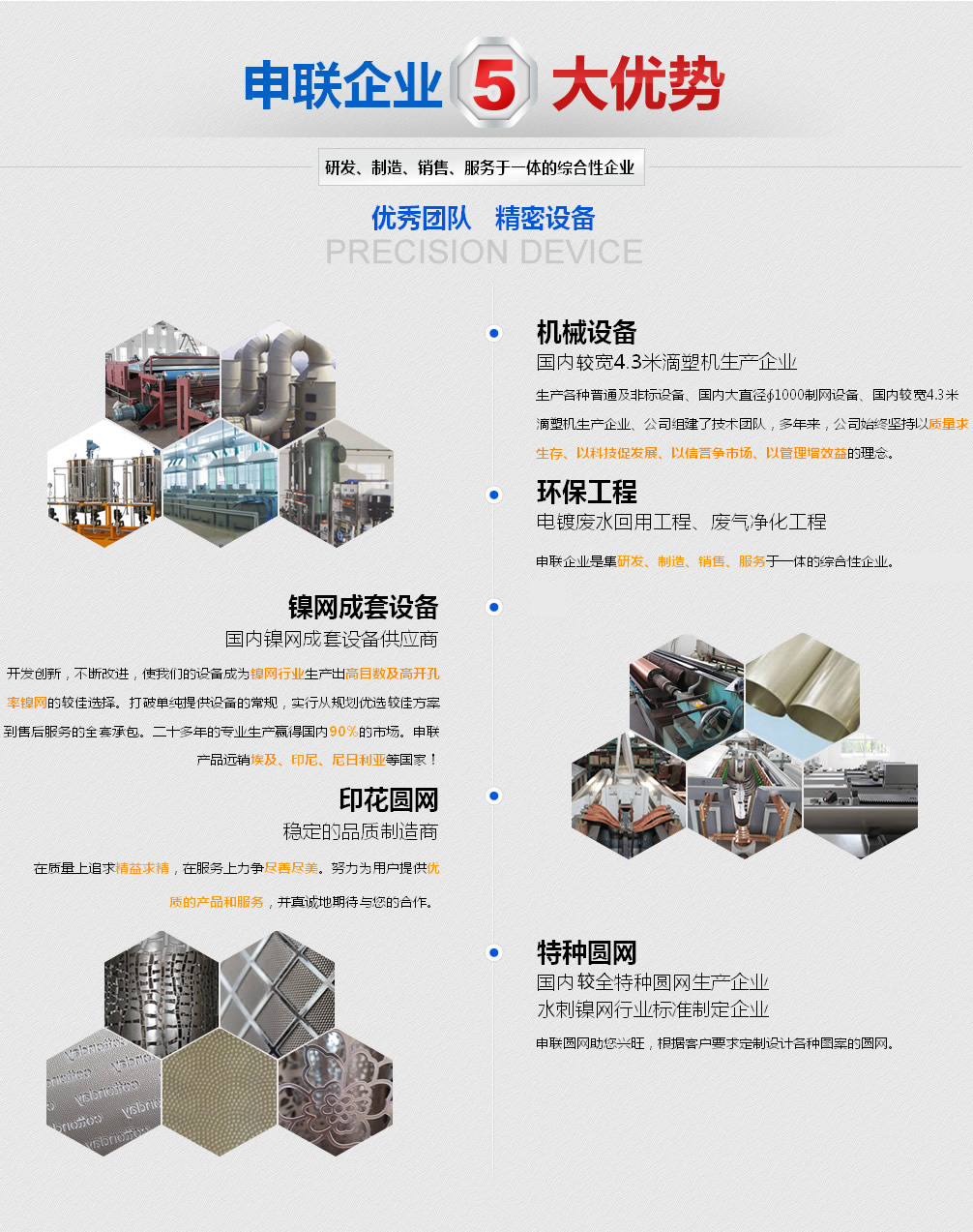 申聯(lián)企業(yè)是一家集機械設備、環(huán)保工程、鎳網生產成套設備、印染鎳網、特種鎳網等系列相關產品的研發(fā)、制造、銷售、售后服務于一體的綜合性企業(yè)。企業(yè)屬下有宜興申聯(lián)機械制造有限公司和宜興市申聯(lián)環(huán)保紡織器材廠有限公司。